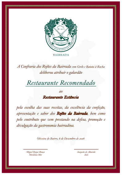 No passado dia 6 de Dezembro a Confraria dos Rojões da Bairrada, com Grelo e Batata à Racha, reuniu em Assembleia Geral Ordinária, no restaurante Estância, em Oliveira do Bairro e atribuiu o galardão de “Restaurante Recomendado à ESTÂNCIA.